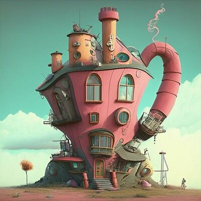 Искин: Смотрите, думаю, именно такой дом мечты абсурдопедиста — в виде большого розового чайника с окнами и даже с ручкой-вытяжкой.