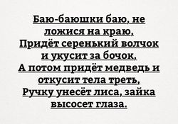 Абсурдопедия Образовательная: Колыбельная — фольклорное средство запугивания маленьких детей опасными животными и прочими инфернальными существами непосредственно перед сном.