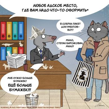 В случае, если всё это собрано, чиновник обратится к вертикали власти, и собранное отправится через круги мытарств, где потеряется, будет найдено, потребует обновления, случайно сгорит в архиве, попадёт в торнадо с почтовой машиной, пока, наконец, просителем не будет получен отказ или, что является статистической погрешностью, разрешение, которое просителю уже не понадобится по причине мирной кончины от старости.