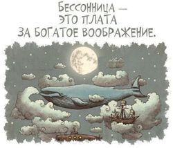 Бессонница — достижение состояния полного просветления, когда мелкие земные проблемы, вроде сна, не смущают ваш ум. Расширяет сознание и открывает тайну времени, замедляя его ход: оказывается, в сутках 24 часа и 1/4 из них практически некуда девать, особенно в ночную пору, когда компанию вам могут составить лишь 12 тысяч насчитанных овец, ваш верный кот и люди-антиподы из другого полушария, посредством интернет-общения.