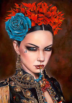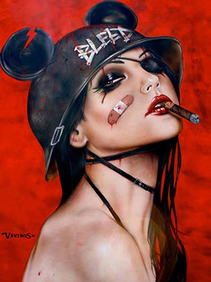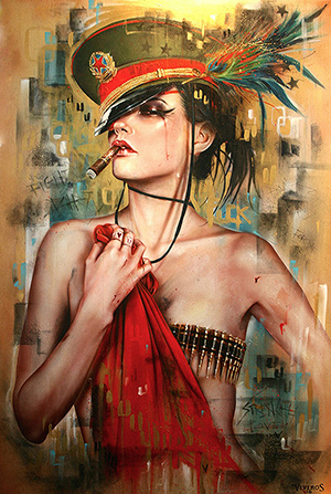 На фуражке у девушки советская символика, и она держит в руках красную тряпку. Видимо, она имеет непосредственное отношение к Советскому Союзу. На фоне остальных героинь картин Вивероса она выделяется своей красотой. Но почему же эта красивая модель позирует на фоне вандально исписанной стены, причём, исписанной по-английски? Неужели в Советской России не умели писать по-русски? К тому же, на стене есть и матерные выражения. Неужели культура была столь низкой, что никто не знал орфографии даже русских матерных слов? И почему не могли сдержаться и вообще не писать на стенах? Или другой вариант: она находится не в СССР, а в Америке. Но что её заставило эмигрировать из родной страны за океан? Значит, в любом случае, жизнь в СССР, с точки зрения американца Вивероса, была не фонтан. А где-то сбоку на фуражке зачем-то затесалось павлинье перо, но оно, видимо, нужно для отвлечения внимания от важных социальных проблем, показанных на картине лишь тонким намёком.