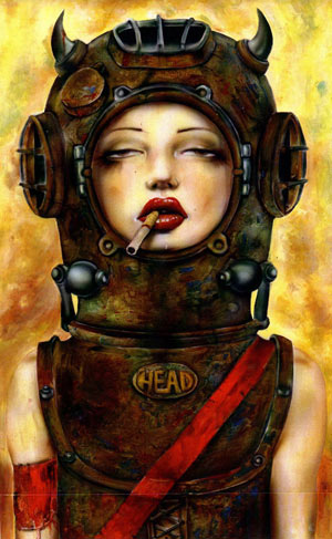 Здесь изображена очень грустная девушка, которая выделяется своей унылостью даже на общем фоне не самых весёлых героинь картин Вивероса. На голове у неё водолазный шлем. Правда, шлем оборудован рогами, но им можно не придавать значения, потому что Виверос вообще является любителем рогатых головных уборов, и ничего с этим не поделаешь. Через плечо у девушки перекинута широкая красная лента, наподобие ленты выпускника или свидетеля на свадьбе. Видимо, сегодня какой-то праздник. Если есть водолазный шлем, то, возможно, этот праздник — день водолаза, который отмечают 5 мая, а она — водолаз? А грустна она потому, что её мало кто поздравил с профессиональным праздником.