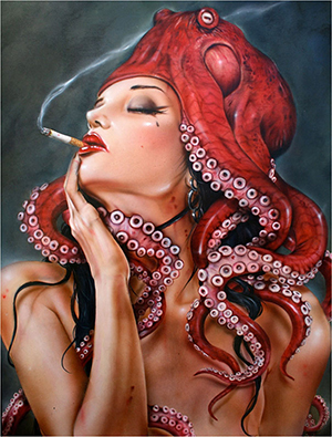 Несомненно, единственно правильным вариантом толкования этой картины является озабоченность Вивероса слишком большим количеством упоминаний Ктулху в Абсурдопедии. Вот, например, открывает он Абсурдопедию 18 марта 2017 года, видит общее количество статей — 3630, а затем печатает в поисковой строке слово «Ктулху» (да-да, именно на русском языке), и видит он, что имеется примерно 600 результатов. Берёт Виверос калькулятор, делит 3630 на 600 и получает 6,05. То есть шутки про Ктулху есть примерно в каждой шестой статье. Виверос возмущается и садится писать картину, где функцию Ктулху выполняет самый обычный осьминог — он окутал голову девушки и, очевидно, пожирает её мозг. Мораль: зачем упоминать каких-то вымышленных персонажей, когда их природные аналоги ничем не хуже?