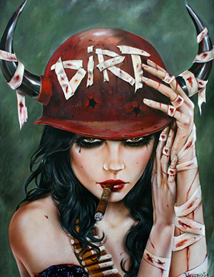 А героиня этой картины, видимо, ощущает себя греховной и хочет продемонстрировать это всему миру. На свою каску она приклеила надпись «Sin», что означает «Грех». На первый взгляд кажется, что всё нормально, но потом, присмотревшись, можно заметить надпись «Unclean» («Нечистая») еле заметно выцарапанную под надписью «Sin». Очевидно, это тот самый случай, когда для «особо одарённых» повторяют по два раза. Уважает нас автор или нет, остаётся только гадать.