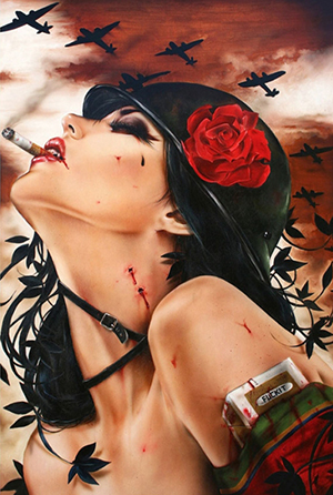 Судя по каске и самолётам, действие происходит во время Второй Мировой Войны, которую, как известно, полмира вело с нацистами. Также примечательно, что на шее виднеются свежие следы от вампирского укуса. Таким образом, автор хотел сказать, что вампиры принимали участие во Второй Мировой Войне. Но какое, и на чьей они были стороне? Вампиры с нацистами имеют не так уж мало общего, как может показаться на первый взгляд. Например, и для тех и для других важна чистота крови, правда, немного в разном значении. Видимо, это неспроста. Таким образом, эта картина Вивероса открывает новый, сенсационный взгляд на историческую науку. Если профессионалы копнут глубже, они вполне могут обнаружить, что Вторую Мировую Войну подготовило мировое вампирское закулисье и оно стремилось освободить жизненное пространство для арийской расы, которую, возможно, считало наиболее вкусной и питательной.
