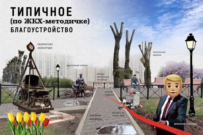 - Проставка во дворе скамеек для отдыха жильцов небоскрёбов с неработающим лифтом.