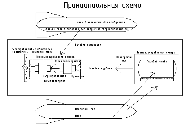 Силовая установка представляет собой сверхпроводимый электрогенератор. Крутящий момент обеспечивает паровая турбина, питаемая перегретым паром из котла, нагреваемого природным газом.