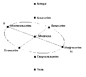 С мирами всё вышло очень просто (в скобках — расшифровка смыслов профессора Шпильбургера). Мидгард (Германия), то есть человеческий мир, соседствует с ещё четырьмя мирами этого уровня, Ванахеймом (Россия) и тремя мирами, принадлежащими великанам (экономическим), — Йотунхеймом (Франция), где обитают йотуны, Муспельхеймом (Италия) — миром огненных великанов, и Нифльхеймом (Британия) — ледяных.