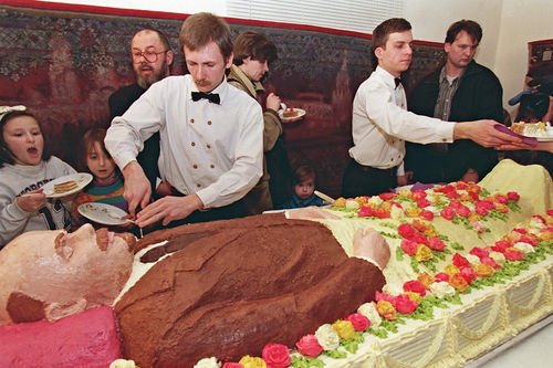 На следующей иллюстрации представлен торт «Ленин». Он определённо больше похож на вождя пролетариата, чем торт «Наполеон» на императора Франции. Точнее, торт выполнен в виде не самого Ленина, а его мумии. Разумеется, сознательные коммунисты, присутствующие на празднике, воздержатся от чрезмерного поедания такого торта, ведь уничтожая его, они как будто бы уничтожают ценный артефакт, хранящийся в Мавзолее и напоминающий о былом величии коммунизма.