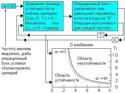 Итог итерационного алгоритма - область устойчивости сферического коня в вакууме (D-разбиение) ограниченная осями и графиком (уменьшение K (коня) и одной из постоянных времени объекта вакуума, как правило, положительно сказывается на устойчивости системы сферический конь — вакуум в целом).